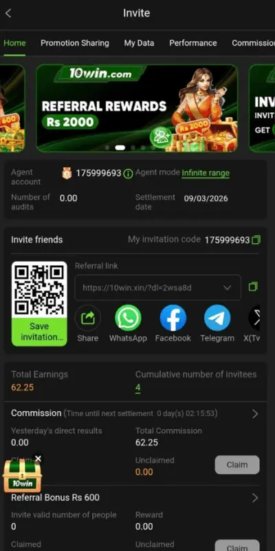 The 10win club referral program allows users to invite friends and earn extra rewards.