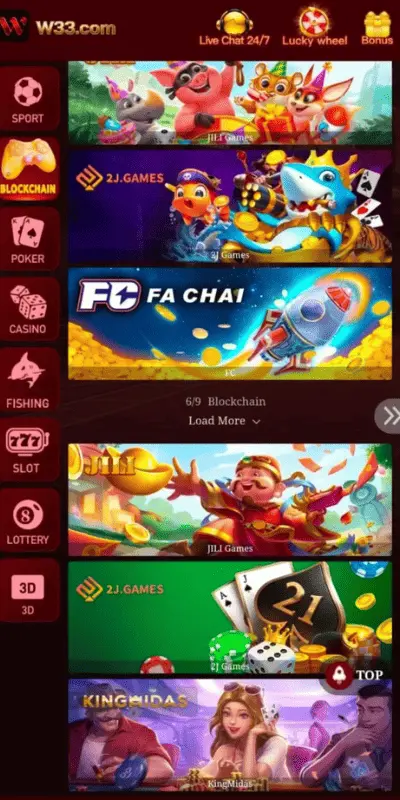The W33game interface is designed for easy navigation. The main dashboard shows games, wallet options, and account settings clearly.